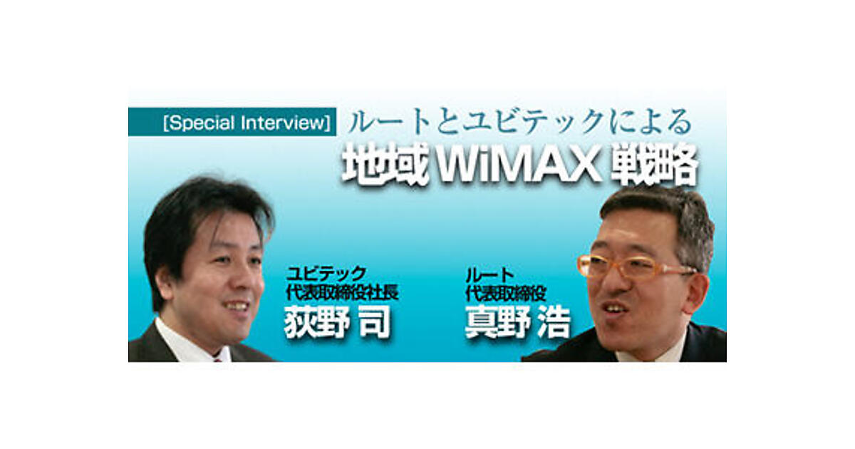 そこで、早い時期からWiMAXによる地域のデジタル・デバイドなどの問題を解決しようと活動してきたアライドテレシスグループのルート株式会社の代表取締役真野浩(まの ひろし)氏と、地域WiMAXのシステムインテグレータである株式会社ユビテックの代表取締役社長荻野司(おぎの つかさ)氏に、地域 WiMAXの課題と展望、ビジネスモデルをうかがいました。