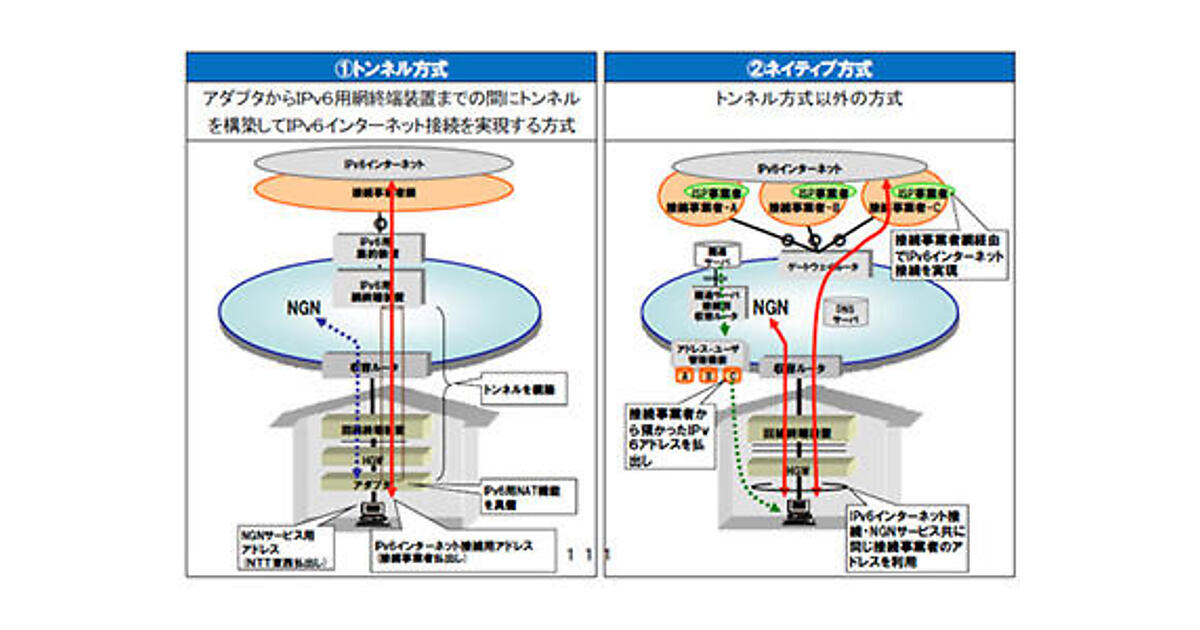 ネイティブ方式は、IPv4のISP接続を含む、既存のNGNサービスにオーバーレイするかたちで、接続事業者(3社)のアドレスをNGN網内のユーザーに直接割り振るという方法である。ユーザー側としては、接続事業者のどれか1つのアドレスが割り当てられるため、マルチプレフィックスの懸念がなく、NATが不要で、アダプタの設置も不要となる。なお、接続事業者数を3社としているのは、NGNと直接接続する接続事業者によるアドレスブロック数が増加すると、ルータで管理され経路情報数もあわせて増加することになり、4社以上になると、現在のひかり電話のQoS(Quality of Service、サービス品質)が保てなくなってしまうためだと言う。そのため、3社という接続事業者数は、現実的な数字となっている。
