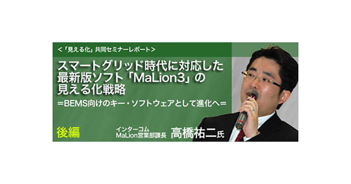 NTTデータソルフィスとNTTデータビジネスブレインズ、インターコムの3社は、グリーンIT/スマートグリッド時代を迎えて、共同セミナー「省エネ&環境負荷低減。効果の見える化はここから始まる。事例から学ぶ効果的利用法」を開催(2012年2月15日)。各社からITを駆使して実現した省エネやコスト削減の具体的事例が発表された。ここでは、「サステナブルな経営環境マネージメントを支援する『MaLion3』」と題して行われた、(株)インターコム 高橋 祐二氏(MaLion営業部課長)の講演内容を紹介する。クライアントPCの運用管理を支援するベストセラーソフトウェア『MaLion3』は、最新バージョンから、環境・エネルギーデータの「見える化機能」も実現している。このため、最新版のMaLion3は、スマートグリッド時代のBEMS(ビルエネルギー管理システム)のキー・ソフトウェアのひとつとしても注目されている。