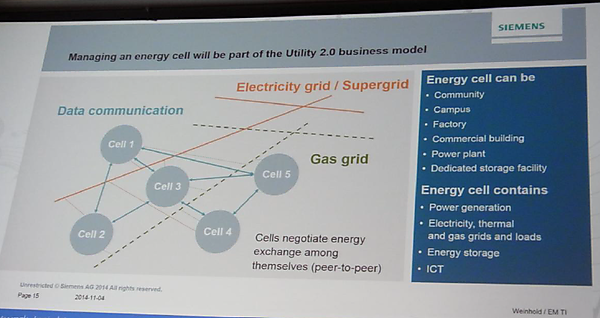 同氏によると、Utility 2.0では、コミュニティや大学のキャンパス、工場などは、「エネルギーセル」(Energy Cell)と呼ばれる小規模なエネルギーのエコサイクルになり、これらが次々と登場すると述べた。このエネルギーセルは、従来の大規模な電力網(スーパーグリッド)と連携しており、同時に、エネルギーセル同士でもエネルギーのやりとりを行えるようになる。