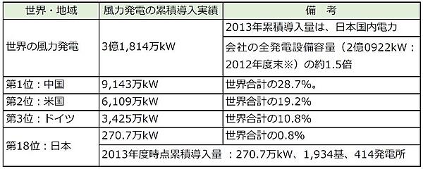 なお、参考までに、日本における風力発電に関して、2013年度までの累積導入量 は270.7万kW(1,934基、414発電所。日本風力発電協会発表)と世界第18位となっている(表2)。