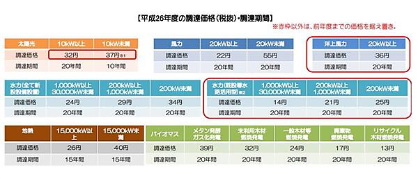 図2に、2014年度の再生可能エネルギーの調達価格(税抜)と調達期間を示すが、例えば、「陸上風力発電」については1kWh(1キロワット時)の発電量につき調達(買取)価格22円(20kW以上。20年間)と55円(20kW未満、20年間)となっており、「洋上風力発電」については36円の価格(20kW以上、20年間)が、2014年度から新設(2014年3月発表)された。