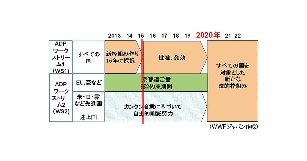 これまでは2008〜2012年までの京都議定書の第1約束期間、2013〜2020年までの自主的削減目標を基礎とした体制が中心となってきたが、今回の会合では、2015年12月に開催されるCOP21(パリ会議)で合意されるべき、新しい2020年以降の枠組みに向けて、包括的な国際枠組みを作ることを主な目的としていた(図参照)。しかし、「先進国対途上国」という対立が残り、最終的には、各国が国別目標案として出すべき中身の最低限の情報要件と、各国が国別目標案を出した後に、それらをまとめた統合報告書をまとめるという形になった。