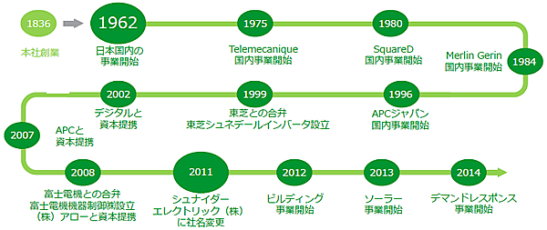 同説明会に登壇した代表取締役社長の安村義彦氏(写真1)は、まず、シュナイダーエレクトリックの日本におけるこれまでのビジネス展開について、図1を示しながら紹介した。