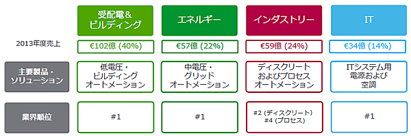 具体的には、図2に示すように「受配電&ビルディング」「エネルギー」「インダストリー」「IT」の4分野に分けられ、それぞれの売上や主要製品は図2中段のようになる。