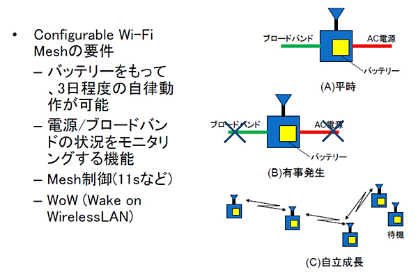 図2の通り、(B)災害・有事発生の場合ブロードバンド機能もAC電源も喪失。(C)WoW (遠隔からの電源投入機能)によってつながるAPを順次接続し、「メッシュネットワークを構成」する。