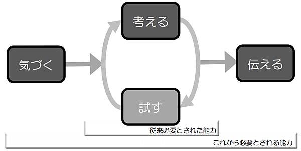 森川氏は、この例のように、M2M時代のビジネス創出のためには、柔軟な考え方が必要であることを強調した。例えば、図5に示すように、従来は、技術の進歩のために「考える」→「試す」の繰り返しのみを行っていたが、新たなニーズや価値に「気づく」こと、そして、それを実現するための技術を「考え」「試し」たあとに、利用者に意味や意義を「伝える」ことまで、デザインする能力が必要とされると締めくくった。