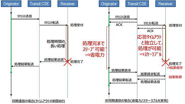 電池で駆動するセンサーデバイスでは、駆動時間を長くするため、通信時間を短縮して、電力消費を抑えることが重要になる。そこで、リリース1では、デバイスが1度リクエストを送信し終わると、基本的には通信を終了してスリープ状態になる「非同期通信」をサポートしている(図8)。ただし、この仕様では、通信エラーがあった場合にはアラートが返ってきたり、もしくは、通信が成功したかどうかを発信側から確認したりすることもできる機能も備えている。