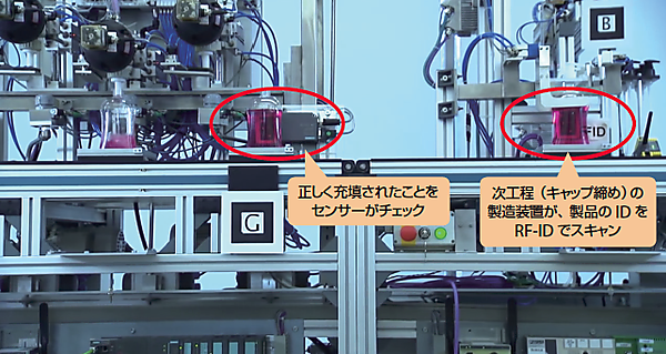 写真の右のボトルでは、次工程(ボトルのキャップ締め工程)の製造装置(工作機械)が、製品のIDをRFIDによってスキャン(走査)し、工作機械と通信することによって、どの種類のキャップをどの程度の強さで締めればよいかなどを判断し実行する工程である。