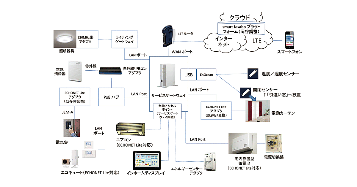 2016年度以降の電力やガスなどのエネルギーの自由化に向けて、居住者が快適性や利便性を意識できるようなスマートハウスやスマートマンション、さらにはこれらを包含するスマートタウン注1の導入の検討が各地で進んでいる。このような動きのなかで岡谷鋼機では、スマートタウン向けに必要な「smart fasaboプラットフォーム」(スマートファサボ プラットフォーム)を市場展開するために製品化を進めている。