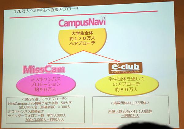 同社が今回協業したキャンパスナビTVは、各大学のミスキャンパスの情報に特化したポータルサイトであるMissCampus.info(http://www.misscampus.info/)や、大学のサークルの情報が交換できるコミュニティサイトであるe-club(https://e-club.jpn.com/)を運営し、合計約170万人の大学生へのアプローチを可能としている(写真6)。