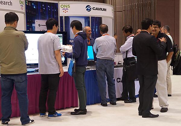 2015年のONSの展示会場において、もっとも注目すべき発表はキャビウム(Cavium、本社 米国カリフォルニア州)社のブースにて展示のあったXPliant(エクスプライアント)プロセッサだろう注6(写真5)。