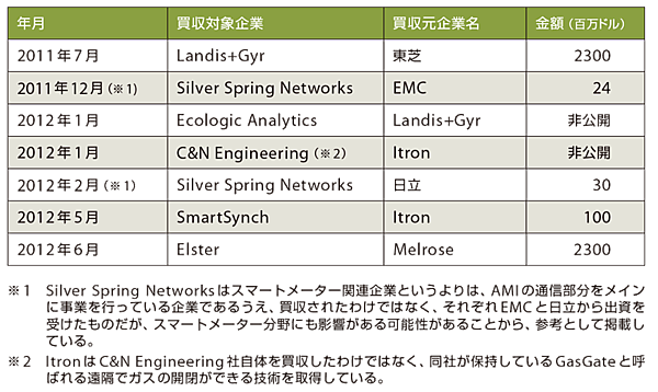 そのようななか、世界を見ると表1のようにスマートメーター関連のM&A(Mergers and acquisitions、企業の合併と買収)が盛んに行われている。