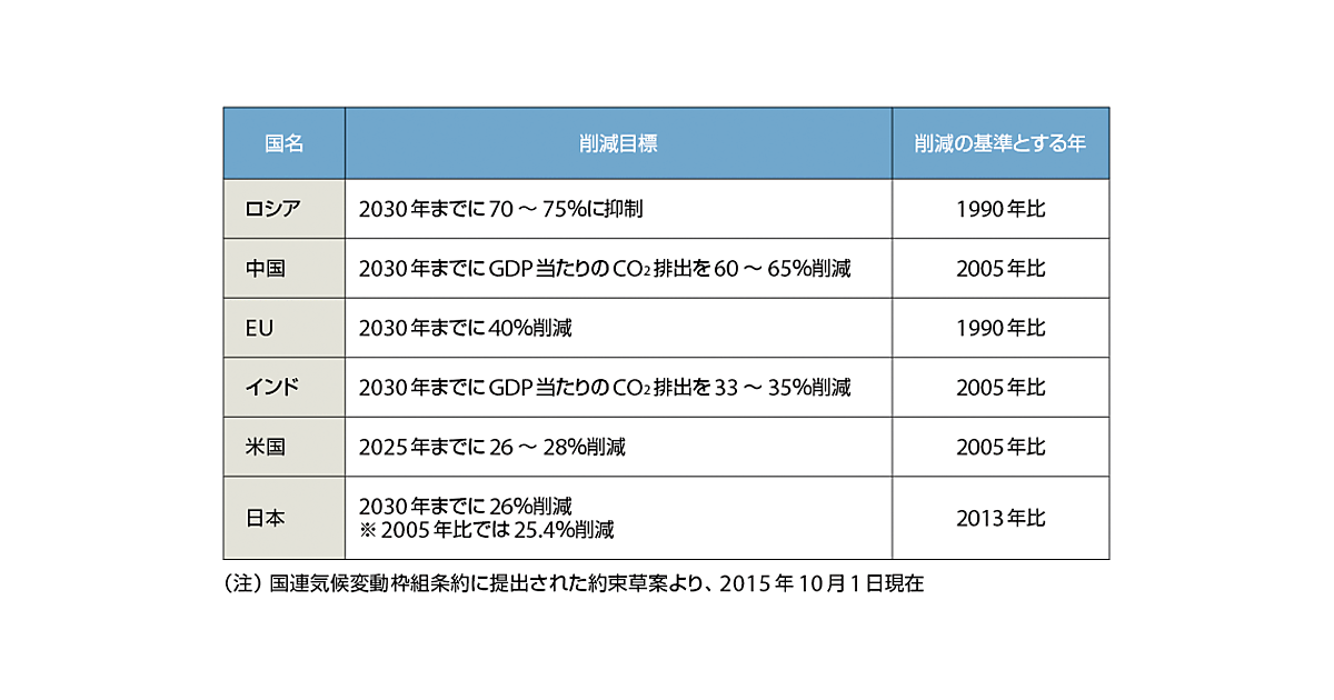 出所 全国地球温暖化防止活動推進センターの資料をもとに作成、http://www.jccca.org/trend_world/conference_report/cop21/