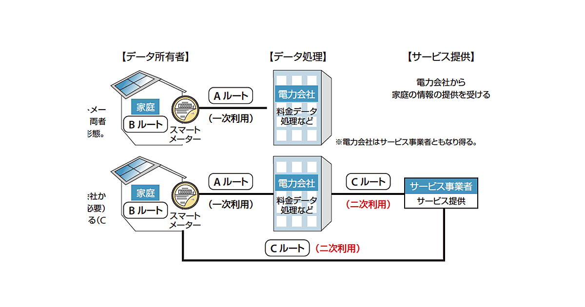 図1は、データ(電力使用情報)の一次利用と二次利用の関係を、身近なスマートグリッド環境の場合で、簡単に示したものである。