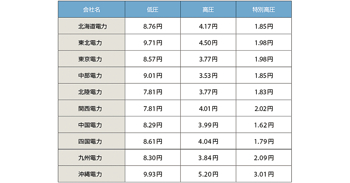 表 認可された各社の託送料金(平均で1kWhあたりの金額)