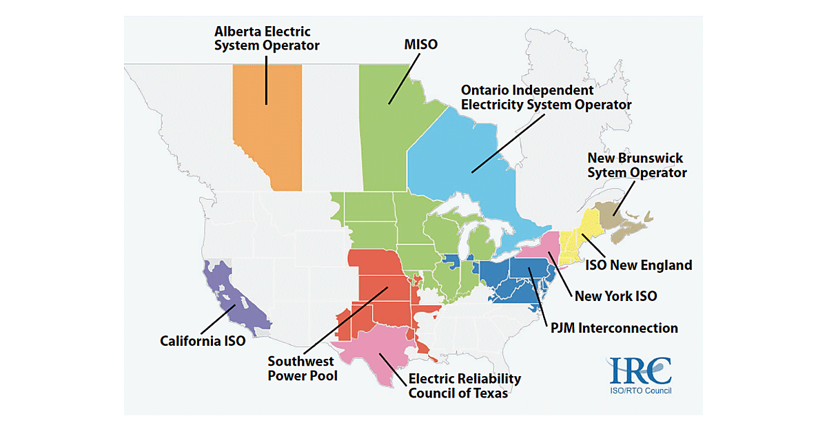 RTO/ISO:Regional Transission Organizations / Independent System Operators、米国の地域送電機関/独立系統運用者。RTOは各電力会社が送電線を個別に系統運用するのではなく、周辺地域と協力して運用する方式。ISOは送電線の系統運用機能を独立的な機関が行う方式。