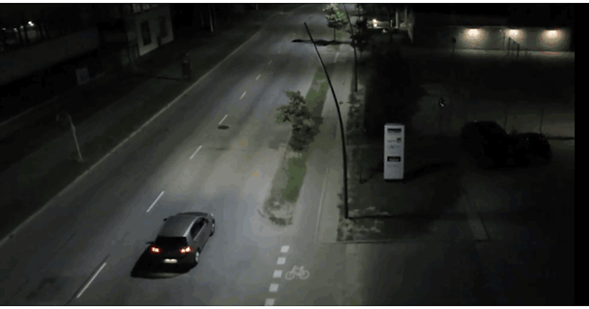 写真3 自動車が走っている付近の街路灯だけが走行に合わせて点灯し、自動車が走っていない場所の街路灯は自動的に消灯している様子