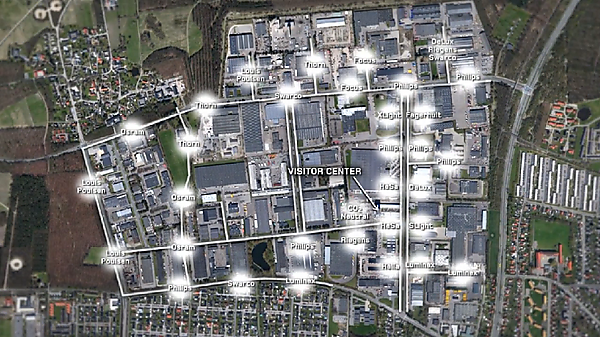 DOLLは市の一部を開放し、グリーン化を促進する技術を支援している。 DOLLでは、デンマークのすべての照明関連企業に声をかけて、インダストリアルパークで、それぞれの最新で最も優れている照明ソリューションをテストしてもらえるように依頼したのである。その結果、インダストリアルパーク内の道路9.2kmに渡ってLED照明に関する複数のソリューション(このケースでは37ソリューション)が設置され(写真1参照)、ここに来れば市場にどんなソリューションが出回っているのかすぐにわかるようになった。これらのソリューションはコントロールセンターからそのライティング状態を制御できるようになっていて、1対1の実際のスケールで詳細に体験してみることができる。つまり、これは巨大なアウトドア照明のショールームといったところで、各社が競い合うのではなくコラボレーションする場となっている。(写真2参照)照明はインテリジェント都市で情報を運ぶインフラストラクチャであり、都市空間を効率よく管理するのに役立てることができる。