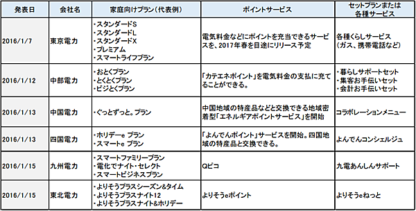 表1 地域電力各社の新しい料金プラン(2016年1月発表分)