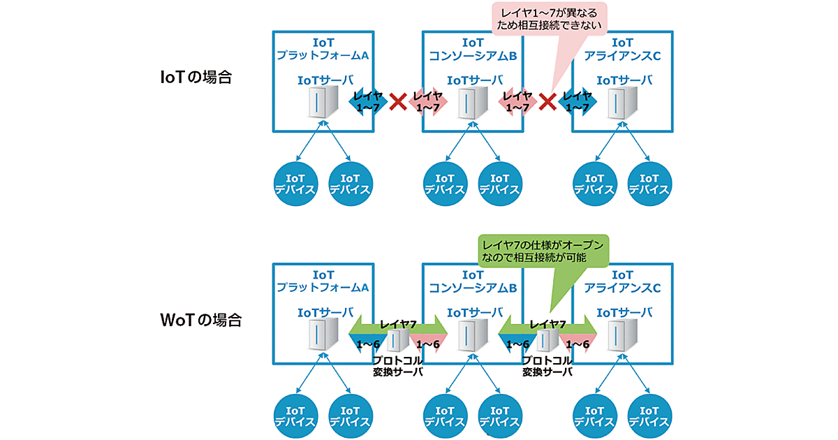 WoTの考え方に基づけば、レイヤ1〜レイヤ6のプロトコルの差異はゲートウェイ(相互接続装置)などによって吸収することができるので、多種多様なプロトコルを採用してもよいが、レイヤ7(アプリケーションレイヤ)はWebのオープン標準技術を採用することが必要である。WoTを採用すると、図1のように複数のIoTプラットフォームを相互接続することが可能になる。