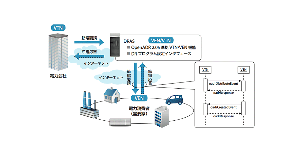DRASの機能やサービスは、VTN(サーバ)からVEN(需要家の端末)へイベントを送る(節電要請)機能と、このイベントに対するVENの応答通知を受信する(節電応答)機能や、VENの状態を確認するためのインタフェースが、必要最小限のセットとなる。VENの応答通知を受信する機能は2.0bで規定される予定のため、同社は2.0bの議論を参考に独自仕様として実装した。