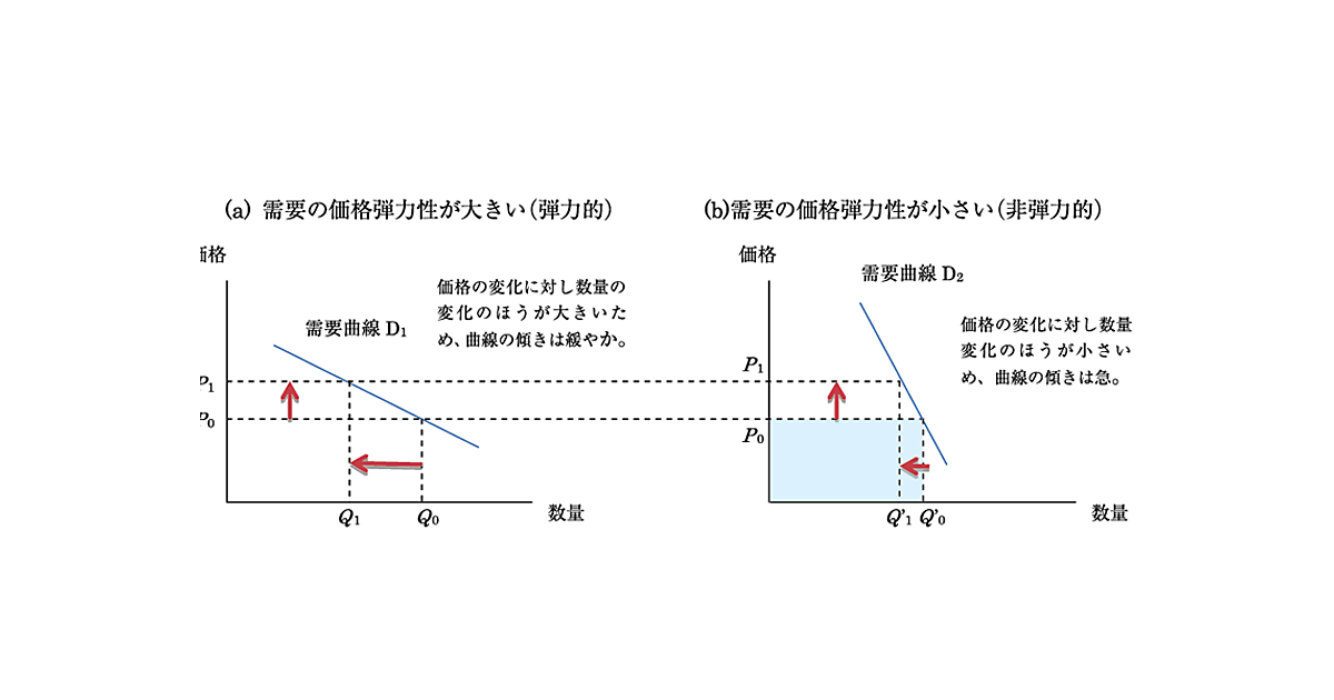 図では、価格の変化は(a)、(b)ともにP0からP1で同じあるが、数量の変化は(a)がQ0からQ1、(b)がQ’0からQ’1である。(a)は数量の変化が大きいので弾力的、(b)は小さいので非弾力的である。