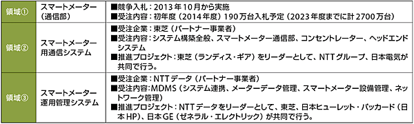 また表1に示すように、スマートメーターに関しては、「通信システム」「運用管理システム」「スマートメーター」関連の事業者選定の3つパート、すなわち図1の領域①〜③に示す3つのパートに分けて、事業者を選定するポイント(選定内容)が提示されている。