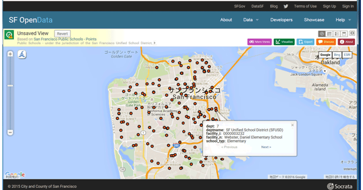 簡単な例をいくつか紹介してみよう。サンフランシスコ市内の公立学校の場所を確認したいときは、図1の画面からData catalogの画面を開き‘school’でキーワード検索すると、San Francisco Public Schools - Pointsという情報、つまり「San Francisco Public Schools(学校名)」と「Points(場所)」を見つけることができ、学校の位置関係が瞬時にわかるようになる(図3)。