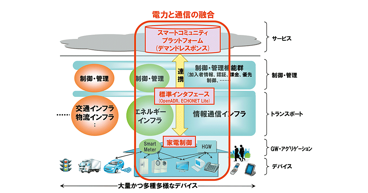 特に電力と通信の融合による新しいビジネス領域である、ピーク時の電力の需給調整において、電力会社など電力を作る側と使う側(ビルや家庭など)がお互いに連携して需給調整を行うデマンドレスポンス(DR)技術は、これまでは電子メールによる通知や需要家による手動調整などであったが、これらを自動化したDR技術を活用して実現する仕組みを開発した(スマートコミュニティPF Ver.1.6)。