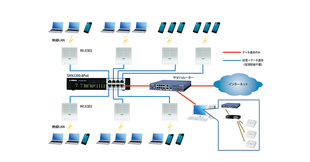 図3に示すように、アクセスポイントやネットワークカメラ、多機能IP電話などの端末は、PoEによって給電されるため、専用の電源は不要となっていることがわかる。