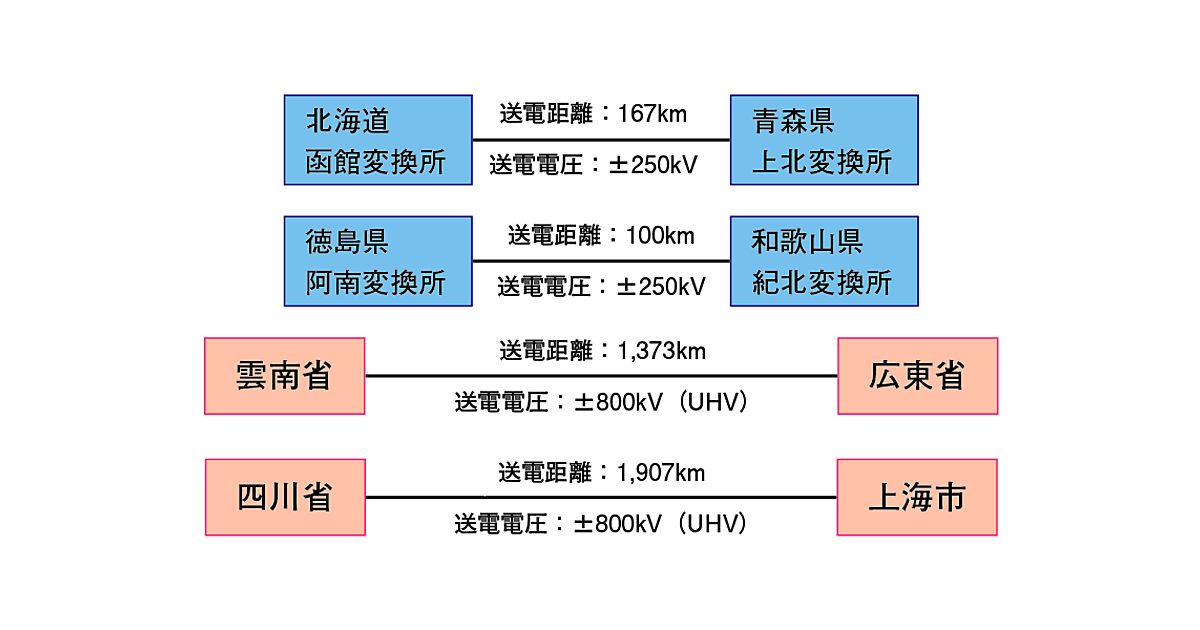 図2 日本と中国の直流送電の送電距離と送電電圧