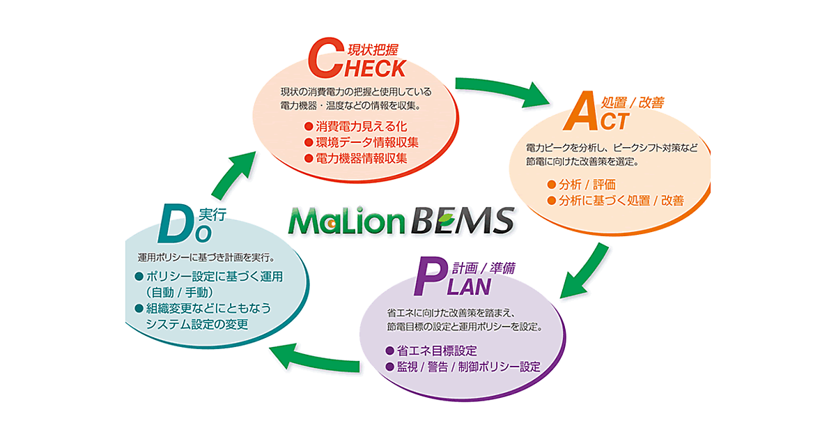MaLion BEMS(Buildingではなく、あえてBusiness Energy Management Servi-ce)とは、電力使用量の運用改善を繰り返し継続することによって、電力使用量の削減を支援するクラウドサービスである。