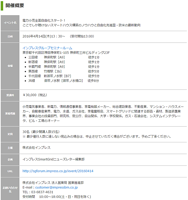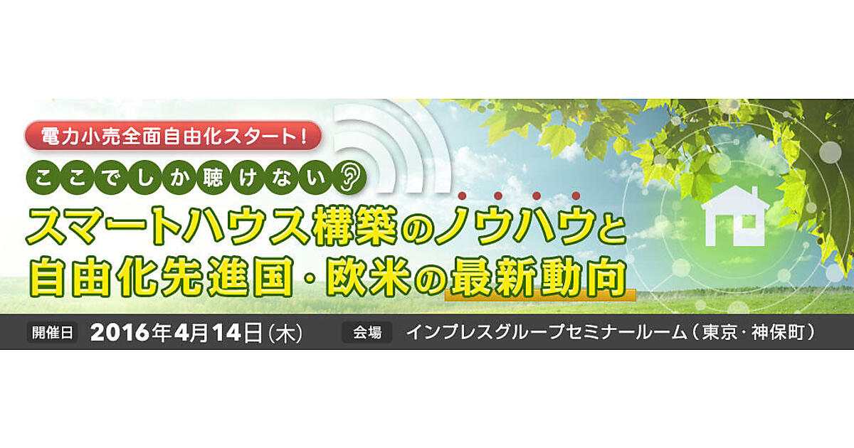 インプレスでは、2016年4月14日(木)に、「電力小売全面自由化スタート! ここでしか聴けないスマートハウス構築のノウハウと自由化先進国・欧米の最新動向」と題したセミナーを開催する。