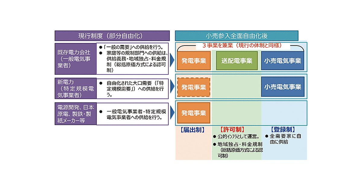 これまで日本の電力の自由化は、図1のように、(制度改革によって1995年から電力卸売自由化は行われているが)ここでは2000年3月以降の段階的な動きを示している。