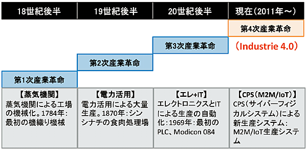 ドイツ政府は、2020年に向けて産業界のハイテク戦略を推進するため、2012年3月に「ハイテク戦略2020行動計画」注1を承認。これに基づいて、工場分野では「スマートファクトリー」として、「Industrie 4.0」という国家戦略プロジェクトを策定し、推進している。 「Industrie 4.0」とは、図1に示すように、第1次(蒸気機関)、第2次(電力活用)、第3次(エレクトロニクス+IT)に次ぐ、第4次の産業革命として位置づけられている。