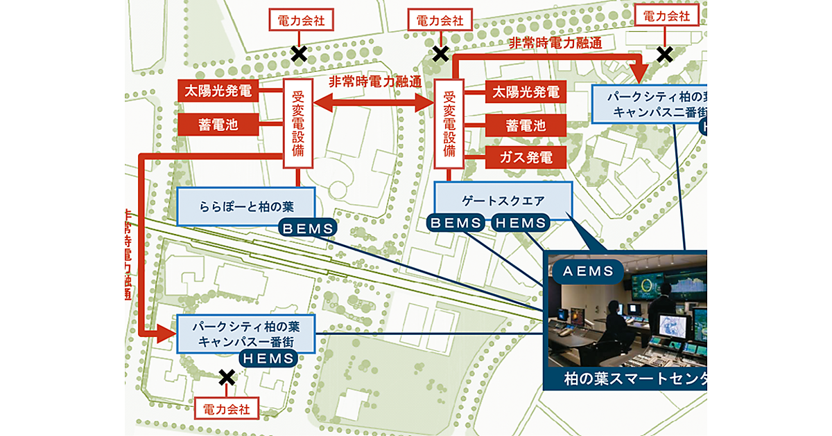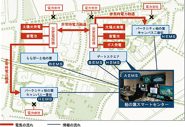 三井不動産株式会社は、千葉県柏市の「柏の葉スマートシティ」において、太陽光発電や蓄電池などの分散電源エネルギーを街区間で相互に融通するスマートグリッド(マイクログリッド)を、2014年7月から段階的に運用開始すると発表した(2014年4月24日)。これは自営の分散電源や送電線を使い、公道をまたいで街区間で電力相互融通を行うシステムであり、スマートグリッドの運用としては、日本初のケースとなる。 地域エネルギーの中核システムは、日立製作所が三井不動産および日建設計と共同開発した「柏の葉AEMS」。これによって、エリア一帯に分散するオフィスや商業施設、ホテル、住宅などの各施設と、太陽光発電や蓄電池などの電源設備をネットワークでつなぎ一元管理する(図参照)。