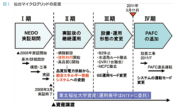 今泉:仙台マイクログリッドは、後掲の特集1-2の記事(9~19ページ)で詳細に紹介されているように、東北電力の系統電力に、燃料電池、ガスコージェネレーション、太陽光発電などローカルなエネルギー源をミックスして、品質別、用途別に電気を供給し、負荷に応じてコントロールを行うというシステムを実証する目的で構築されました。このシステムは、今後、日本のみならず、世界中でエネルギー全体の効率的な利用が必要とされる中で、先駆的な事例であったと思います。 また、実証実験の終了後も、システムは東北福祉大学に資産譲渡され、その運営が継続されています。2011年3月11日の東日本大震災の際には、電力会社による系統電力が停電していた状況にもかかわらず、仙台マイクログリッドが機能し、運転(発電)し続けたということもあり、今日、関係者によって今一度その重要性が再認識され、見直されています(図1)。