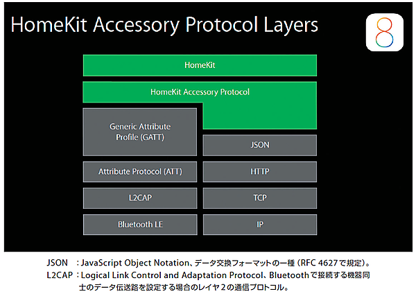 基調講演の後、開催された開発者向けセッション“Designing Accessories for iOS and OS X, Session701”(セッション701「iOSおよびOS X向けアクセサリー設計」)において、図2のようなHomeKit関連のプロトコルHomeKit Accessory Protocol(HAP)のレイヤ図が公開されていた。