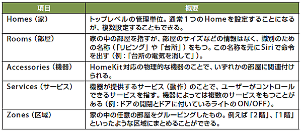 HomeKitでは家(Homes)を単位として、表1のような項目を管理することができる。