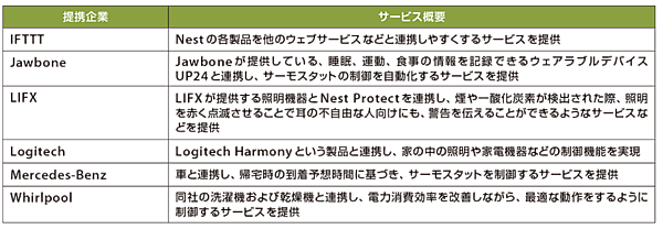 このNest Developer Programでは、第三者の企業や開発者がNestのサーモスタットや火災報知器と連携するためのAPI注8が発表され、同時に、Nest Developer Pro-gramの最初の提携企業と、その具体的なサービスが公表された。現時点で具体的なサービスとして公表されているのは表1のとおりである。