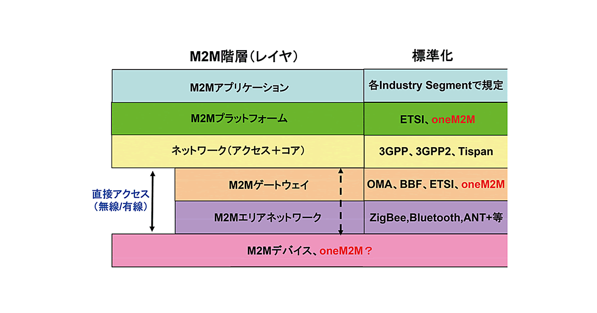 図2に、oneM2Mの標準化のスコープ(標準化の範囲)を示す。現在は、サービスレイヤ(M2Mプラットフォーム)の要求条件、すなわちアプリケーションに近い部分のM2Mプラットフォームの要求条件が完成したところである。また、今後、この次の段階として、アーキテクチャや各レイヤのプロトコルなどを順次、標準化