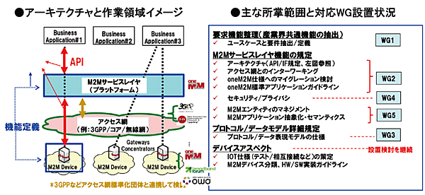 具体的には、図2の右側に示すように、それぞれの5つのワーキンググループ(WG1〜WG5)のスコープ(所掌範囲)が分担されている。