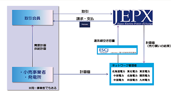 JEPXで行われる取引の場合は、これらの一連の過程がシステムを介し、自動的に連系されて行われる。JEPXのシステムを介して約定した翌日の取引に関する情報は、電子的にシステムを通じ、電力会社のネットワーク部門に送られる仕組みとなっている。