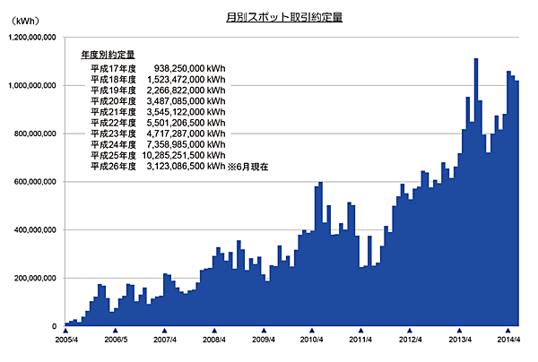 平成23(2011年)年4月に減少している理由は、東日本大震災(2011年3月11日)後に東京電力エリアでの取引が一時的にできなくなったことによるものである。その後は、順調に伸びており、平成25(2013)年度には100億kWhを上回る水準に至った。