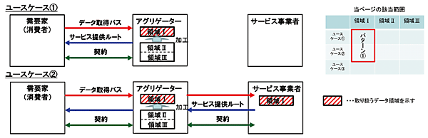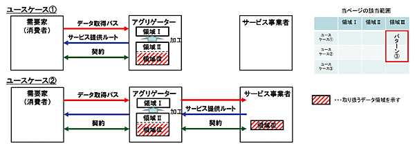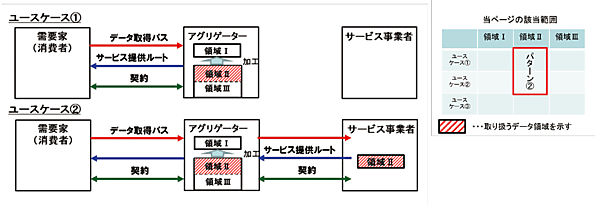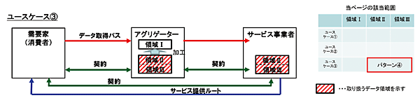 - 個人情報保護法上の対応:このパターンでは、表1に示したように、領域Ⅰのデータは個人情報を含まないため、アグリゲータは、個人情報保護法上求められる利用目的の明示や第三者提供に関する本人の同意取得は不要である。