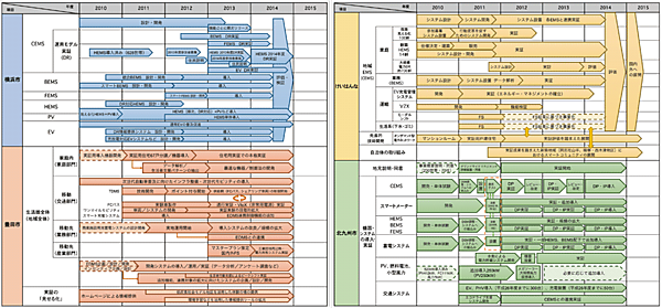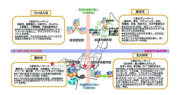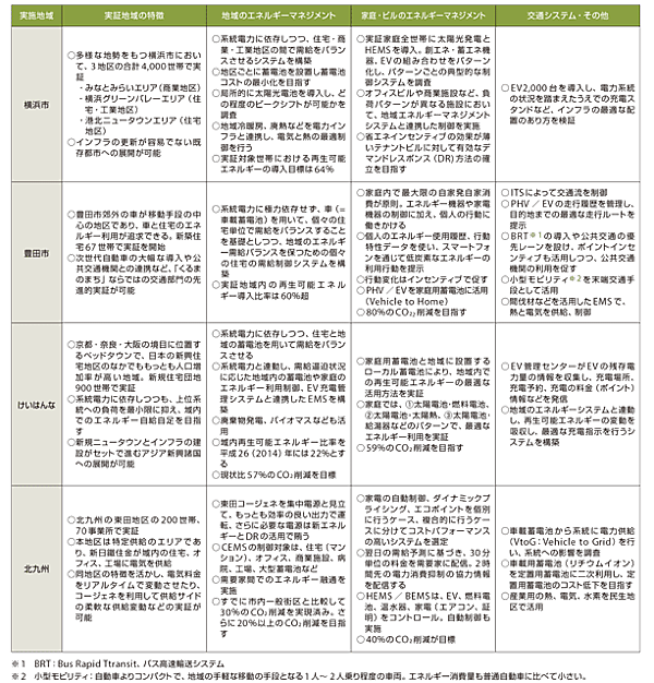 次に、前述した横浜市、豊田市、けいはんな学研都市、北九州市の4 地域で行われている実証実験について、各プロジェクトの概念図を図2に、事業内容を表1に、スケジュールを図3 に、成果を表2に示す。