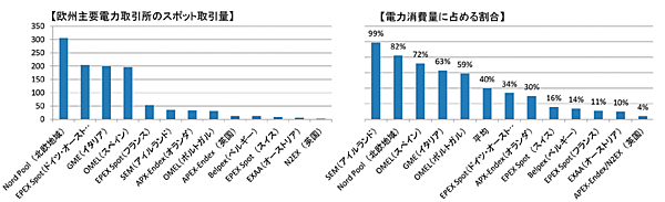 図2に、欧州における主要な電力取引所の取引量を示す。図2の左に「1年間のスポット取引量」を、右側に「電力消費量に占めるスポット取引量の割合」を示す。