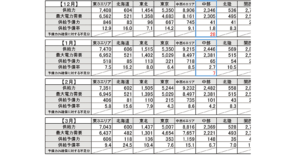 2016年度冬季の電力需給見通しは、2011年度冬季並み(北海道エリアについては更に厳寒であった2010年度並み、東北および東京エリアについては2013年度並み、沖縄エリアは2015年度並み)の厳寒となるリスクを織り込んだうえで、すべてのエリアにおいて電力の安定供給に最低限必要な予備率3%以上を確保できる見通しとしている。
