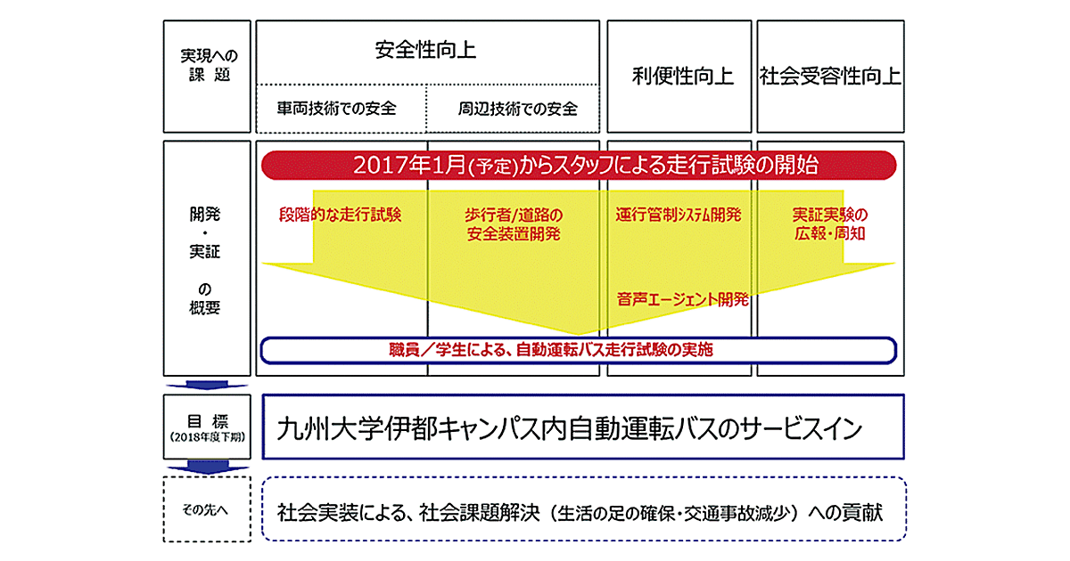 このような背景のもと、九州大学、NTTドコモ、ディー・エヌ・エー(DeNA)および福岡市の4者によって2016年7月8日に結成された「スマートモビリティ推進コンソーシアム」は、九州大学伊都キャンパス内において、2017年1月から自動運転バスの実証実験を開始する注2。
